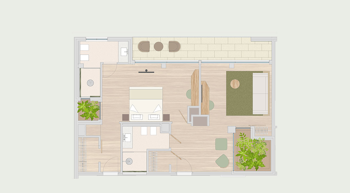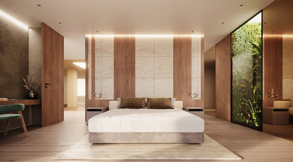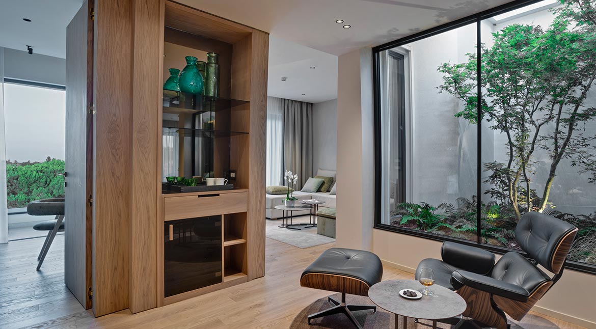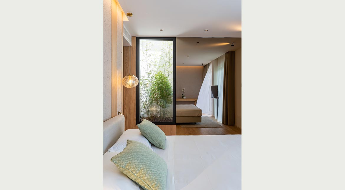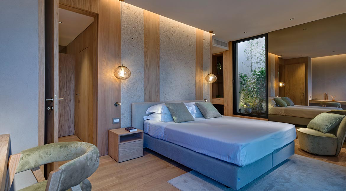 Designed according to the principles of organic and biophilic architecture, according to which the presence of natural elements and every chromatic and material choice, from the oak plank floors to the natural lime walls, to the large windows, are functional to the well-being of the guest, in perfect symbiosis with the surrounding environment.