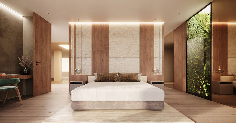 Designed in accordance with the principles of organic and biophilic architecture, according to which the presence of natural elements and every choice of colour and material, from the oak plank floors to the natural lime walls, to the large windows, are functional to the Guest's well-being, in perfect symbiosis with the surrounding environment.